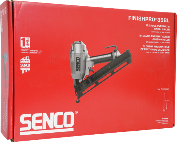 FinishPro35BL er en vinklet pistol, der klarer alle dine sekundære reparationsopgaver. Den slår 1,8 (DA) søm i en længde fra 32 til 63 mm. Værktøjet er en del af SENCO SemiPro-serien, som er designet til lette, semi-professionelle og gør-det-selv-anvendelser. SemiPro-værktøjet har en restriktiv aftrækkerfunktion for maksimal sikkerhed og er bygget efter strenge standarder. Den er let at få øje på med det røde hus og den karakteristiske sorte Senco.